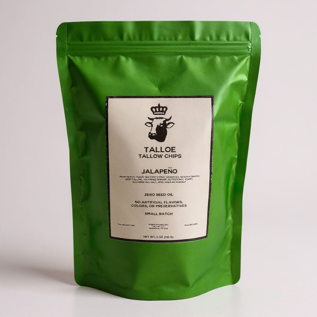 Thinly-sliced Yukon Gold potatoes kettle-cooked in grass-fed, grass-finished beef tallow until golden brown, dusted in Redmond Real Sea Salt, jalapeño powder, nutritional yeast, MSG, and vinegar powder.