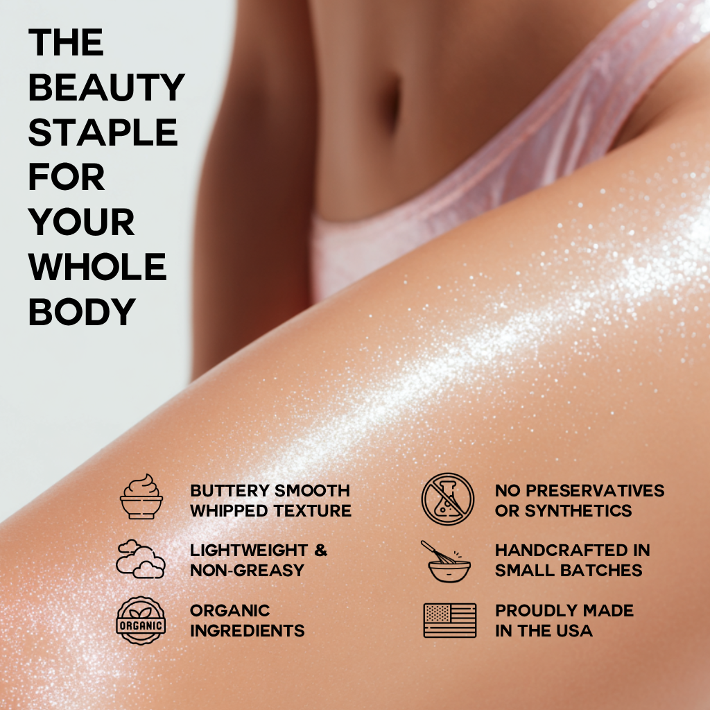Our moisturizing balm is designed to deeply hydrate, soothe, and restore your skin, wherever it needs it. Luxuriously thick, yet light and airy, this balm effortlessly melts into skin, thanks to our whipping process that creates a light, fast-absorbing texture—never heavy or greasy. These soothing ingredients restore hydration, reduce irritation, and promote a healthy, glowing complexion.